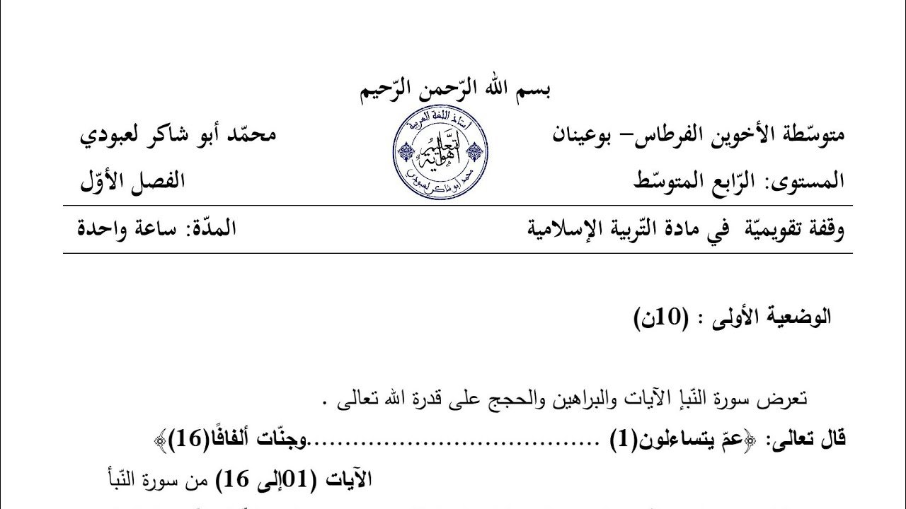 فرض في التربية الإسلامية لتلاميذ #04متوسط /إعداد محمد أبو شاكر لعبودي